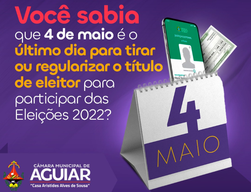 Jovem eleitor, 4 de maio é prazo final para diversas solicitações. Já anotou essa data no seu calendário? Essa é a data final para fazer alteração de dados, transferência do local de votação, a regularização e até mesmo a solicitação do Título de Eleitor! Para isso, basta acessar o site do TRE-PB para realizar seu requerimento.