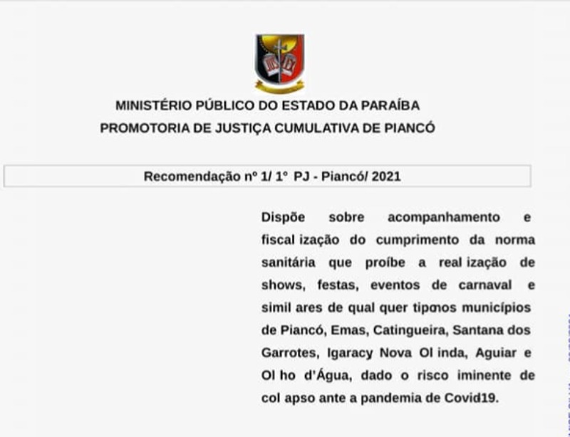 Em atendimento ao Ofício nº 142 encaminhado pelo MInistério Público da Paraíba, através da Promotoria de Justiça de Piancó, a Câmara Municipal de Aguiar faz reforçar a Recomendação que dispõe sobre acompanhamento e fiscalização do cumprimento da norma sanitária que proíbe a realização de shows, festas, eventos de caranval e similares na cidade.