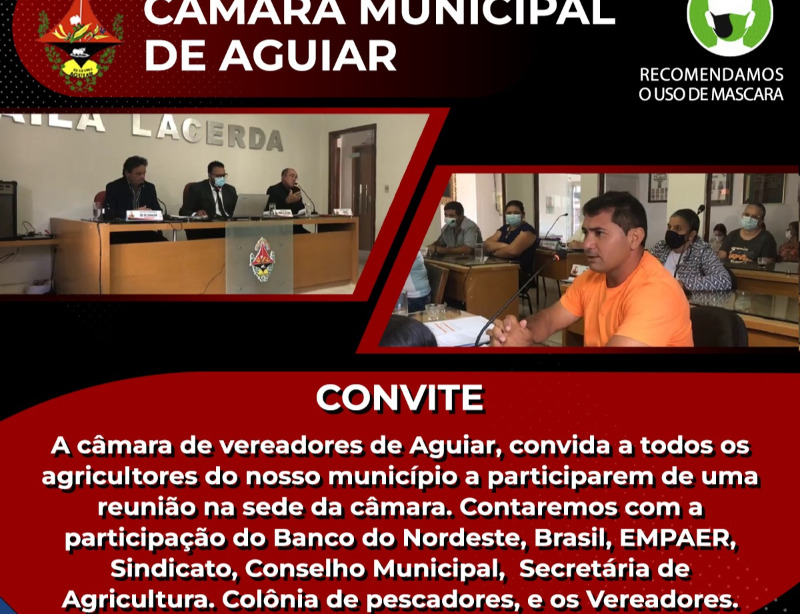 O presidente da Câmara de vereadores de Aguiar, Marcos Dantas Pedro convida a todos os Agricultores e população em geral para participar de uma reunião no dia 31 de maio terça feira ás 08:00horas da manhã na sede da câmara. Agradecemos a presença de todos.