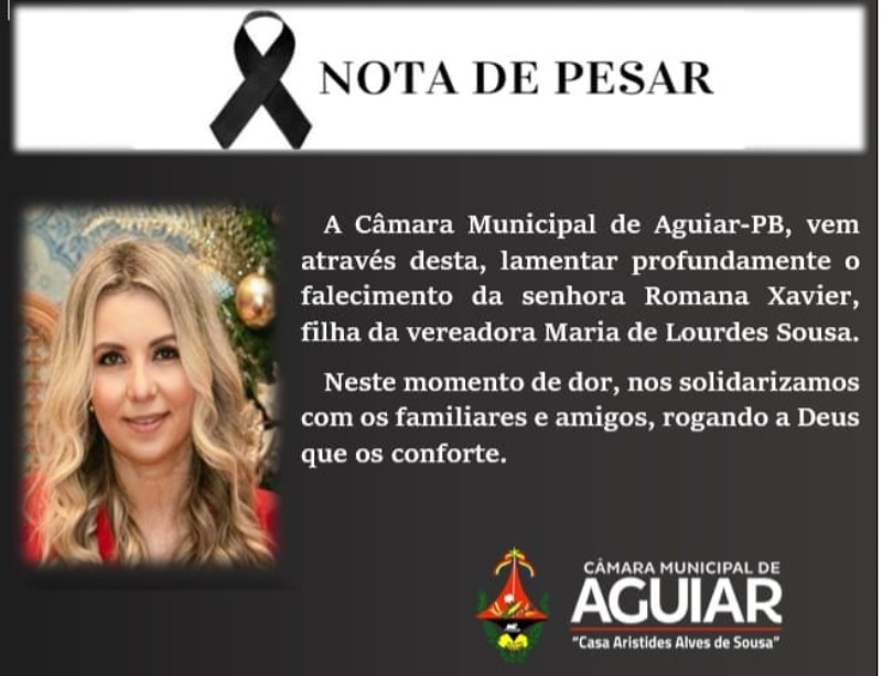 É com muito pesar que esta Câmara de Vereadores de Aguiar-PB, vem respeitosamente desejar a família da Sra Maria de Lourdes Sousa (Lourdes Regina) Vereadora, e ao esposo Agenor Mendes os votos de pêsames a todos os familiares por esta perca irreparável.